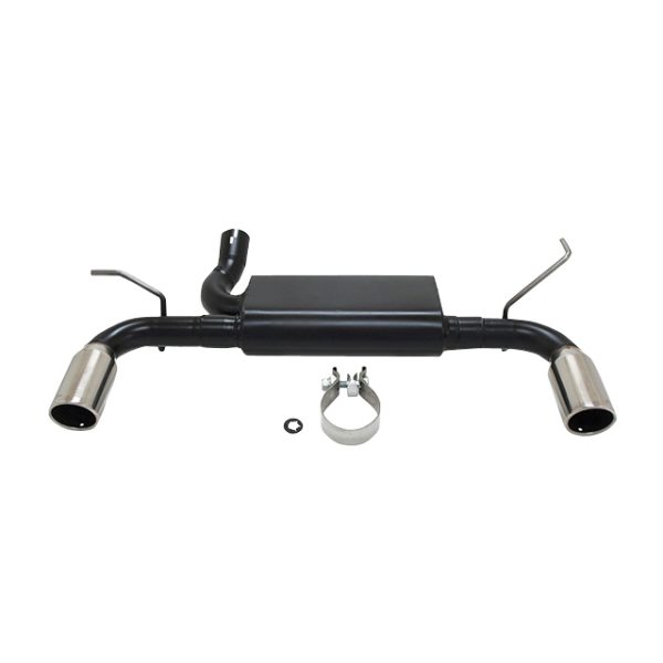 An axle-back exhaust replaces the rear muffler section of the factory exhaust system and is designed to improve exhaust sound and styling.